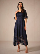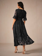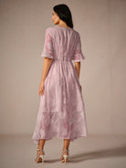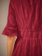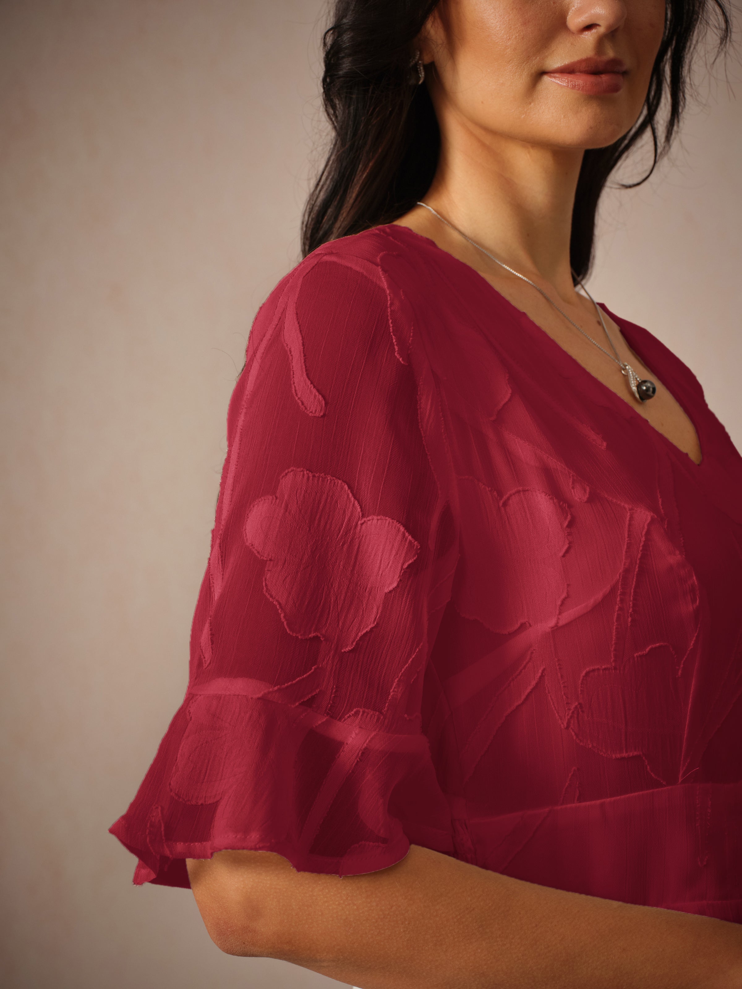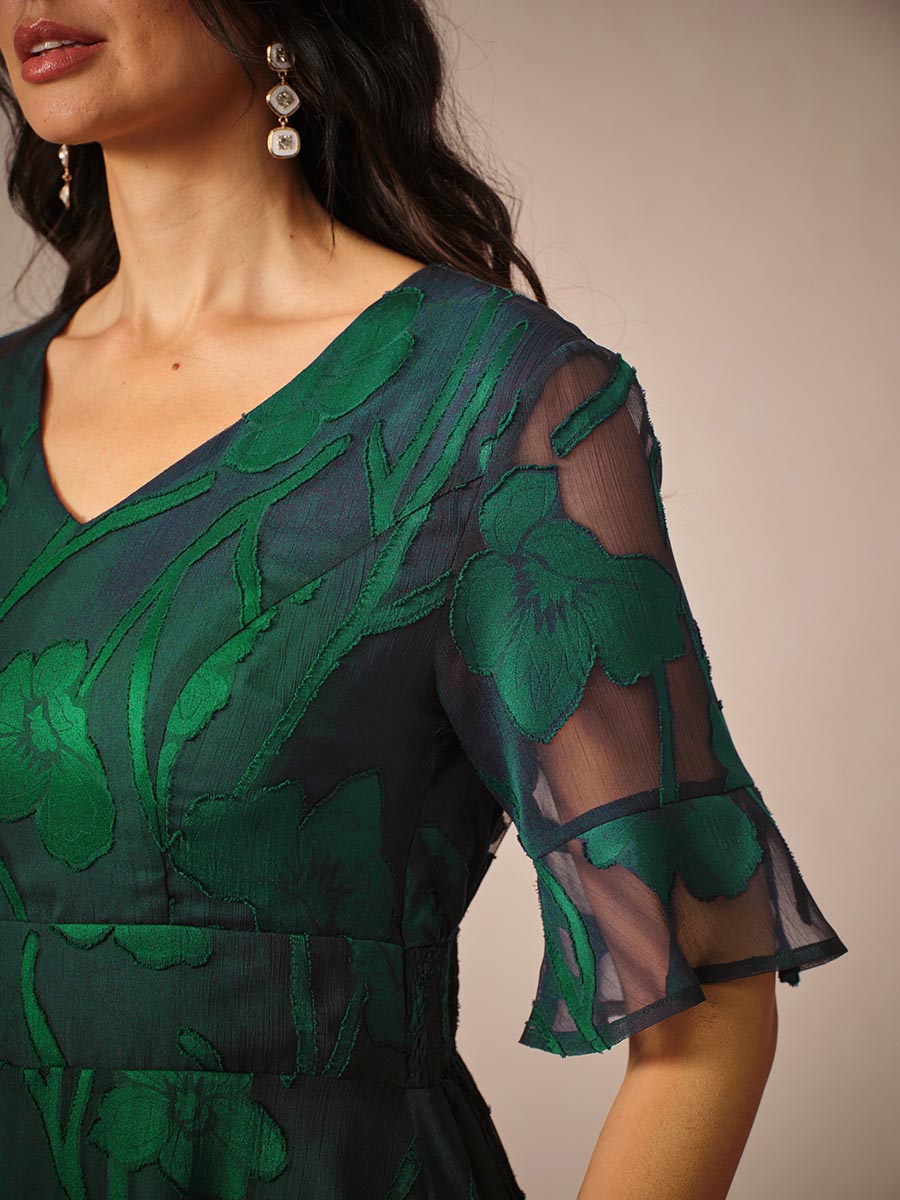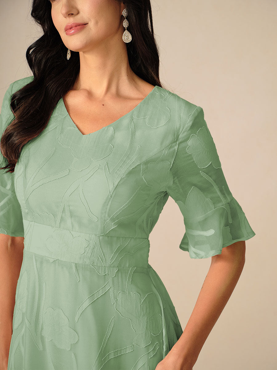 This lace dress offers a touch of elegance, ideal for a wedding guest or cocktail party look. With its refined V-neckline and soft flutter sleeves, the dress has a classic A-line silhouette accented by delicate ruffle details, enhancing its graceful appeal.