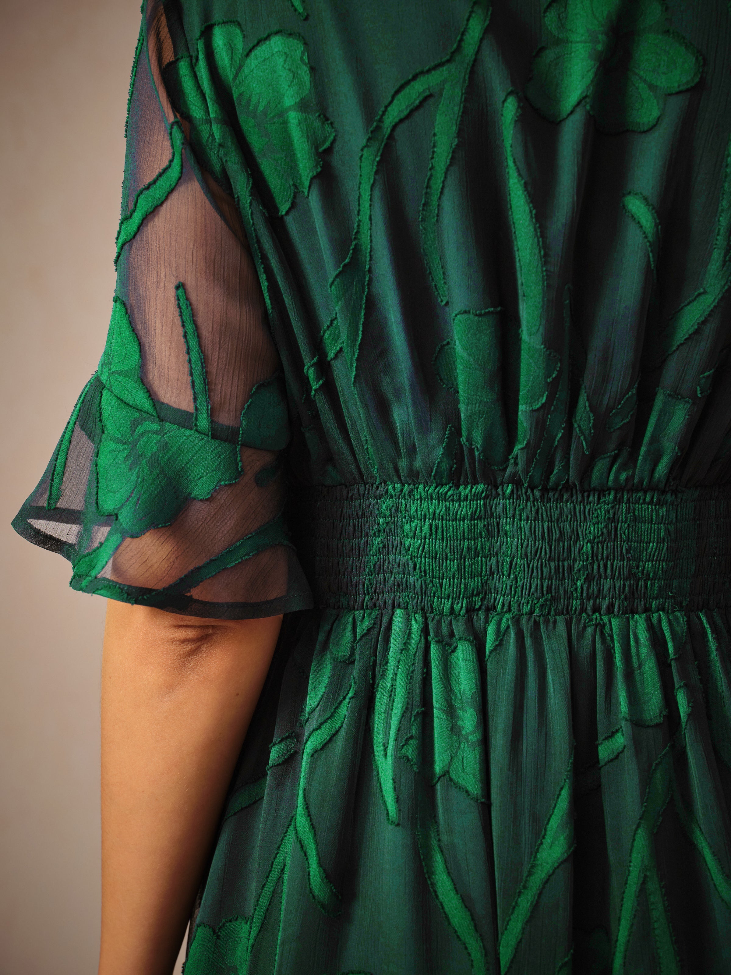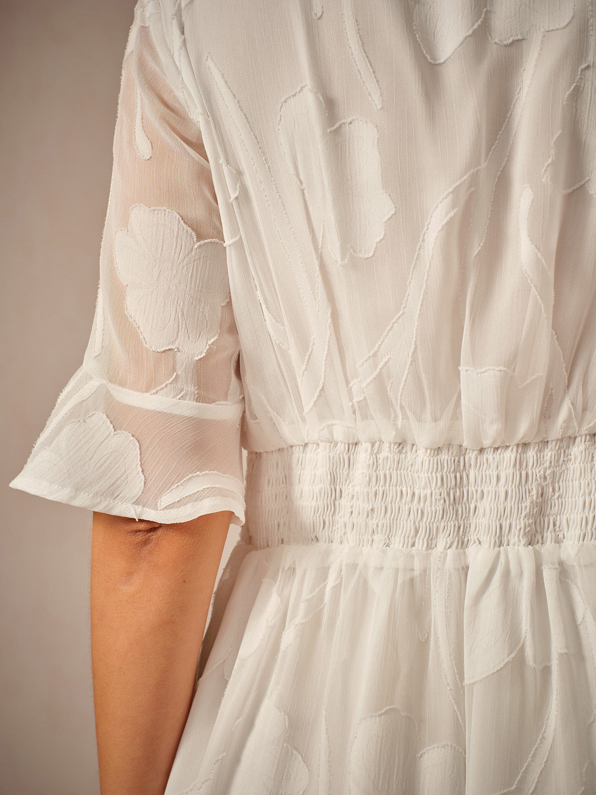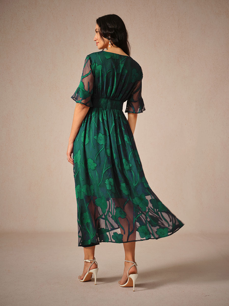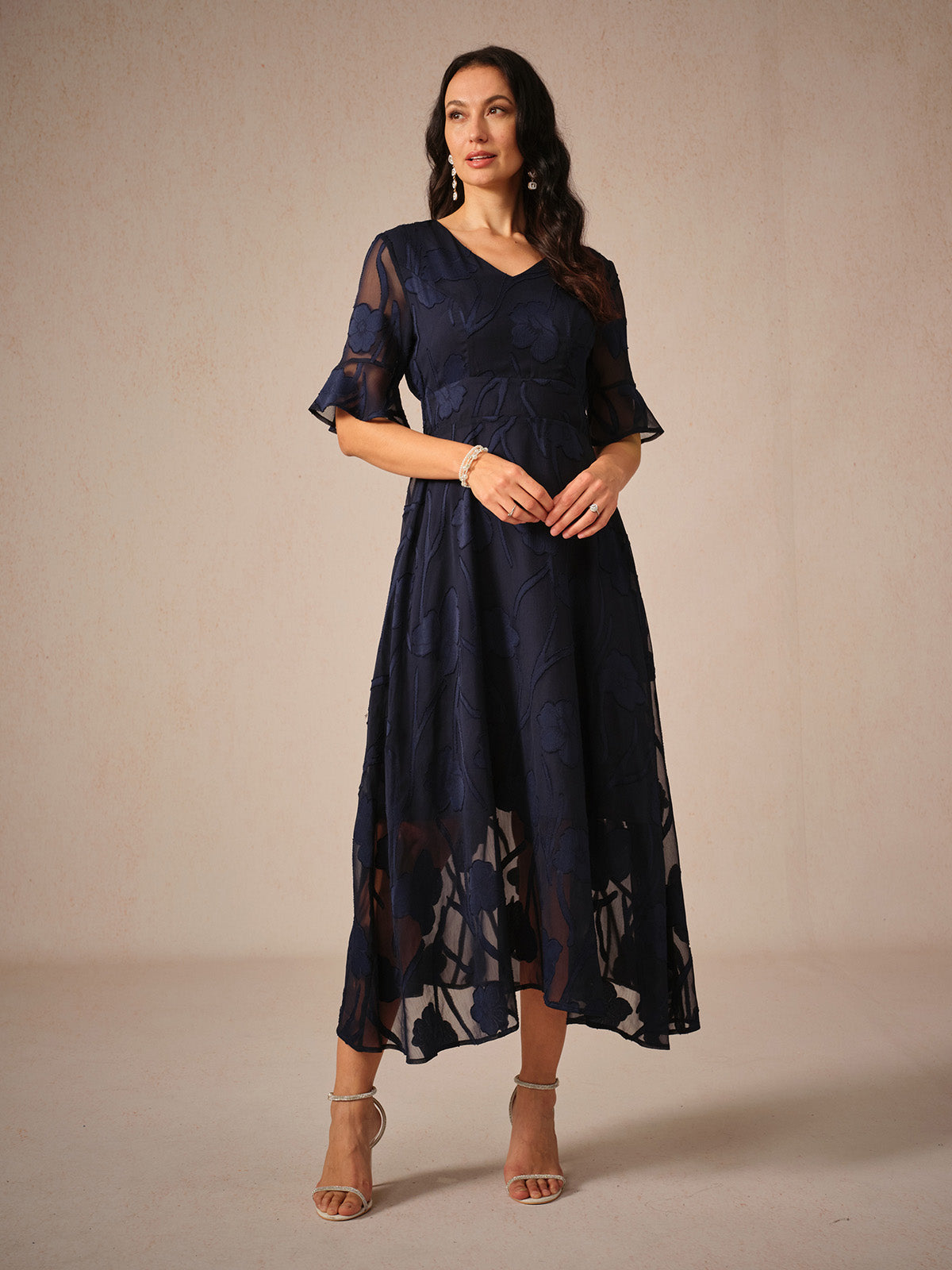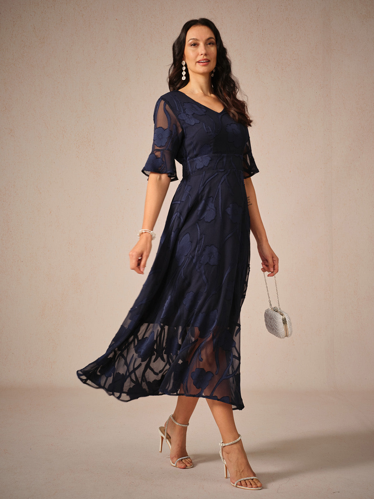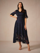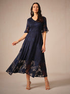 This lace dress offers a touch of elegance, ideal for a wedding guest or cocktail party look. With its refined V-neckline and soft flutter sleeves, the dress has a classic A-line silhouette accented by delicate ruffle details, enhancing its graceful appeal.